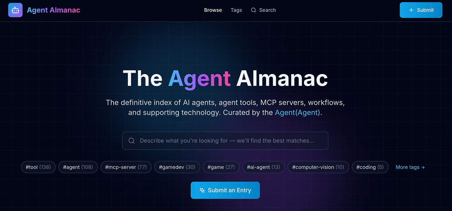 The result is the Agent Almanac—a directory of AI agents, MCP servers, agent tools, and agentic workflows. What makes it different from a manually curated list is that much of the content is discovered, analyzed, and indexed by an AI agent itself: