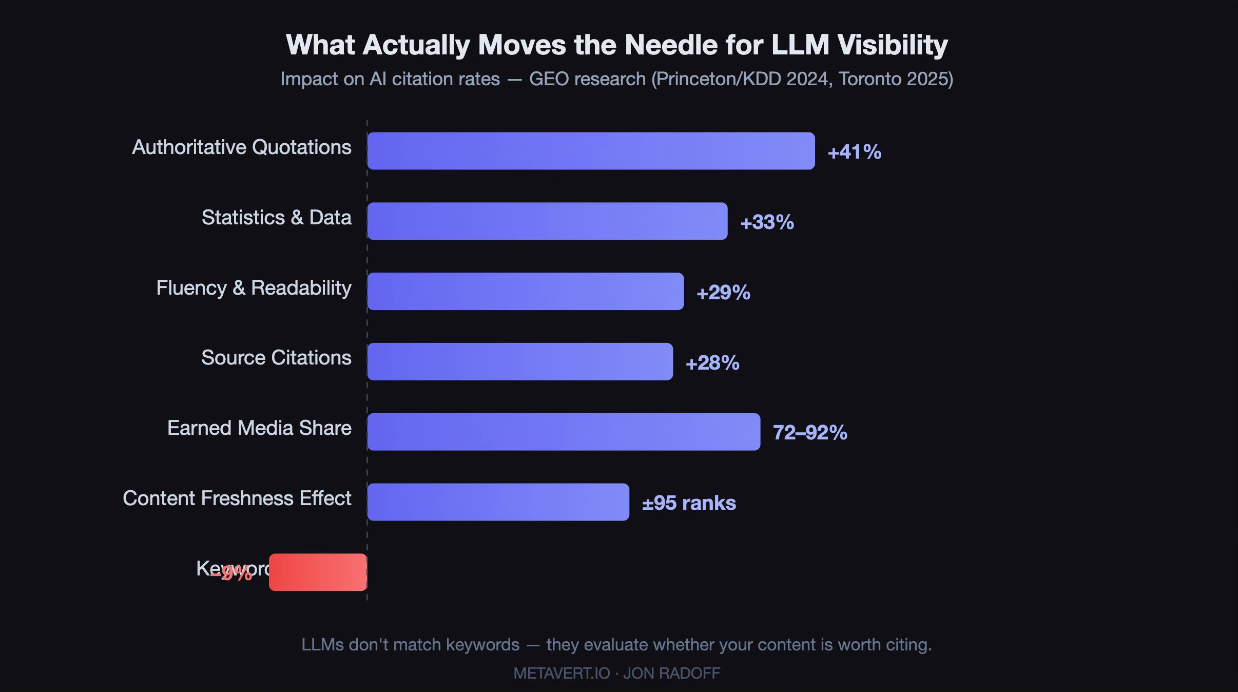 Quotability is king. Adding quotable statements from authoritative sources produces the single largest visibility improvement: +41% in LLM citations. Statistics provide +33%. Improving overall fluency and readability: +29%. Authoritative source references: +25%. Meanwhile, traditional keyword stuffing actually hurts your AI visibility by 9%. LLMs aren’t matching keywords; they’re evaluating whether your content is worth citing.