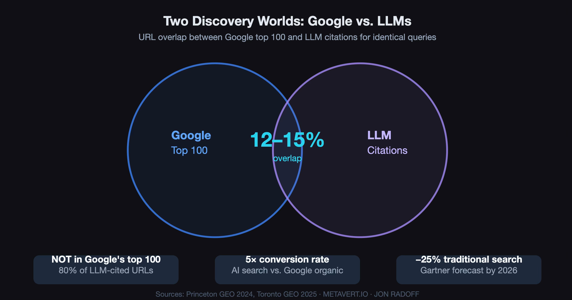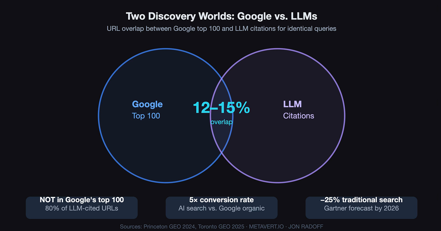 Here’s a number that should reframe how you think about marketing: 80% of the URLs cited by major LLMs don’t appear in Google’s top 100 results for the same queries. Not buried on page five. Not in the supplementary results. Not there at all.