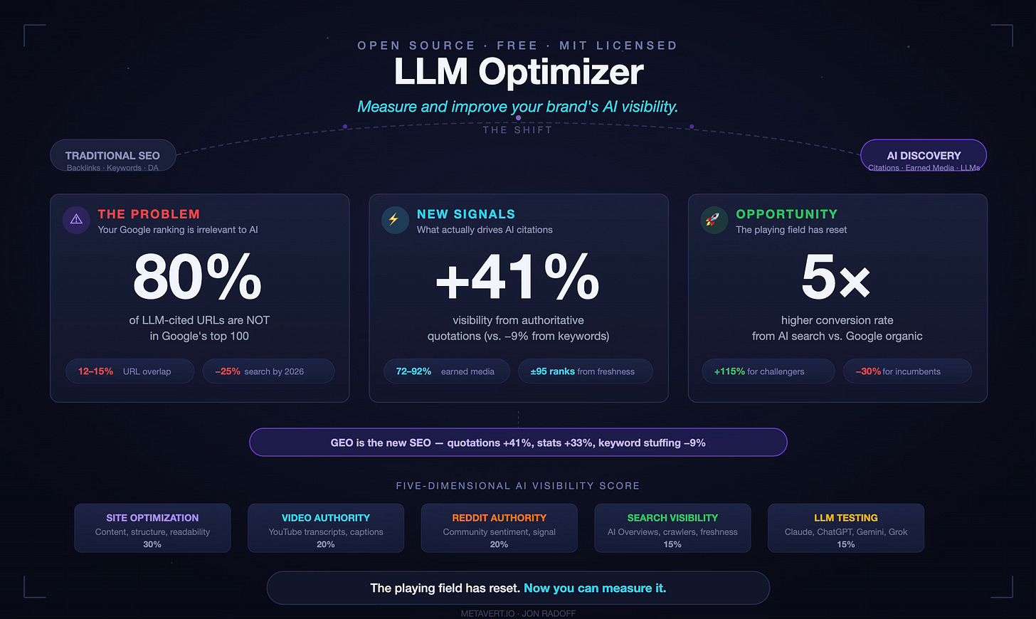 LLM Optimizer is my attempt to make that adaptation measurable and actionable — grounded in the best available research, open-source so anyone can use and extend it, and designed for the agentic workflows that are becoming the default way we build and market.