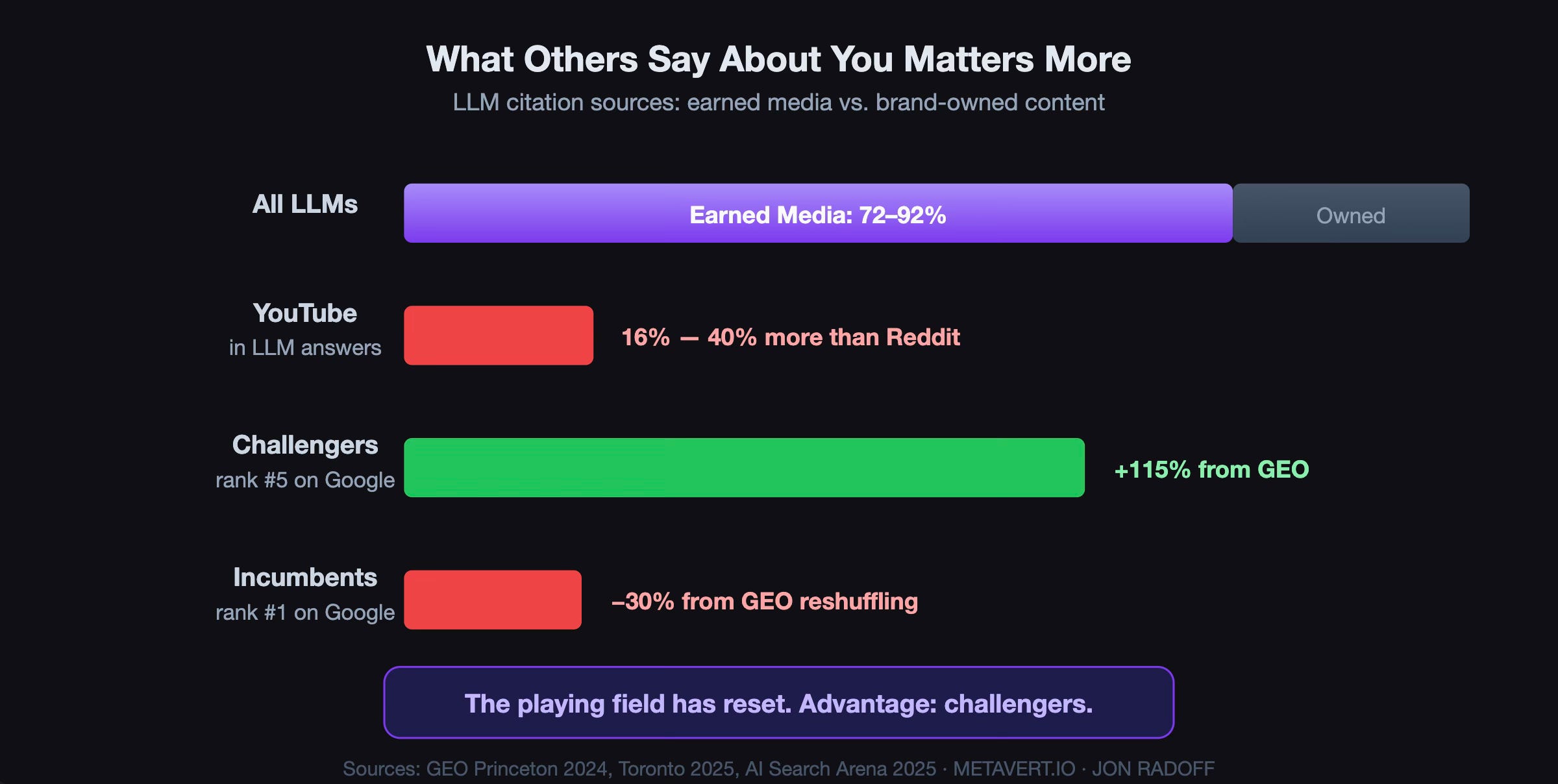 The playing field has reset. Sites that rank fifth on Google see a +115% improvement from GEO optimization. Sites that rank first actually see a −30% effect — because the competitive landscape is completely reshuffled. For challenger brands and solopreneurs, this is extraordinarily good news. The democratization effect is real: the twenty-year head start that established brands built through SEO doesn’t transfer to the new world. The advantage goes to whoever understands these dynamics first.
