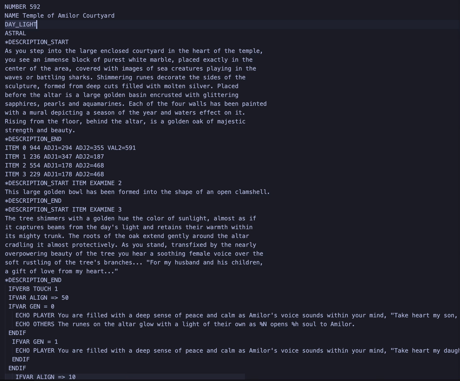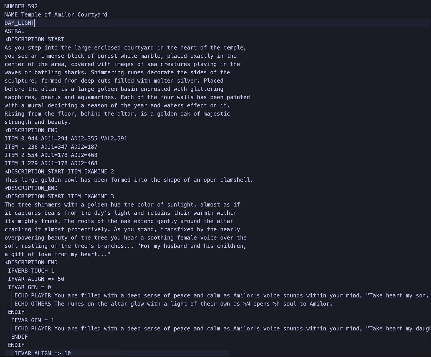 The scripting system used an imperative syntax with conditional blocks—IFVERB, IFVAR, IFITEM, IFPREVERB, ELSE, ENDIF—and supported variable arithmetic, monster spawning, item creation, room transitions, and dozens of other actions. It was case-insensitive, DOS-encoded, and full of the kinds of shortcuts you make when you’re nineteen and optimizing for memory constraints that no longer exist.