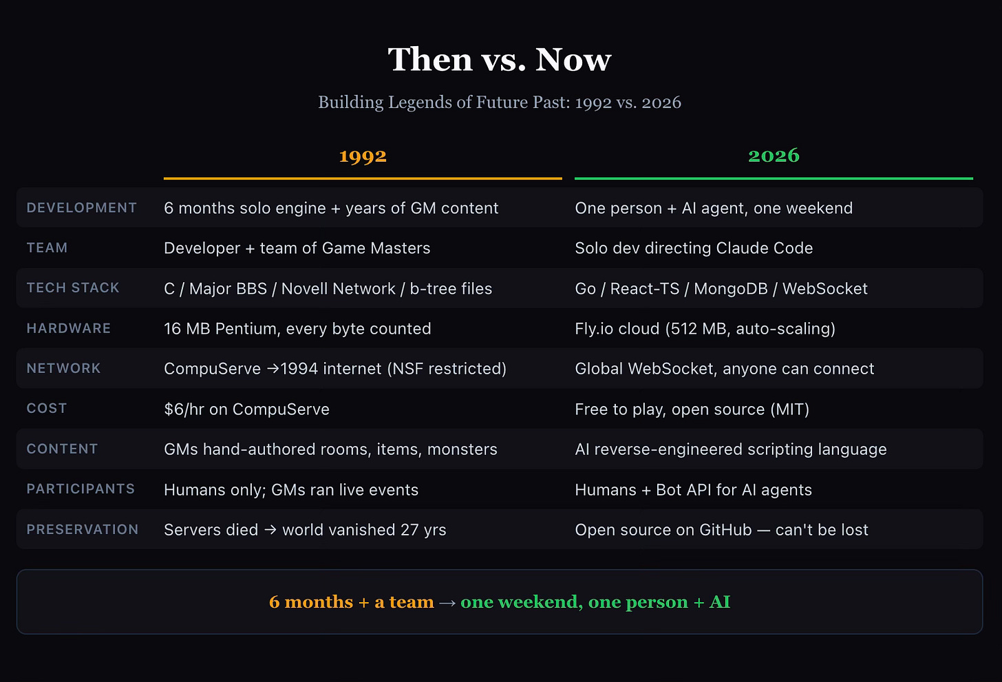 In the 1990s, building Legends of Future Past required months of solo effort just for the engine, plus a whole team of Game Masters building the world over years: writing a custom game engine in C, inventing a scripting language, hand-coding thousands of rooms and items, managing server infrastructure on hardware that cost more than a car. The technical barriers were enormous. Most of what we spent our time on wasn’t creative—it was engineering.