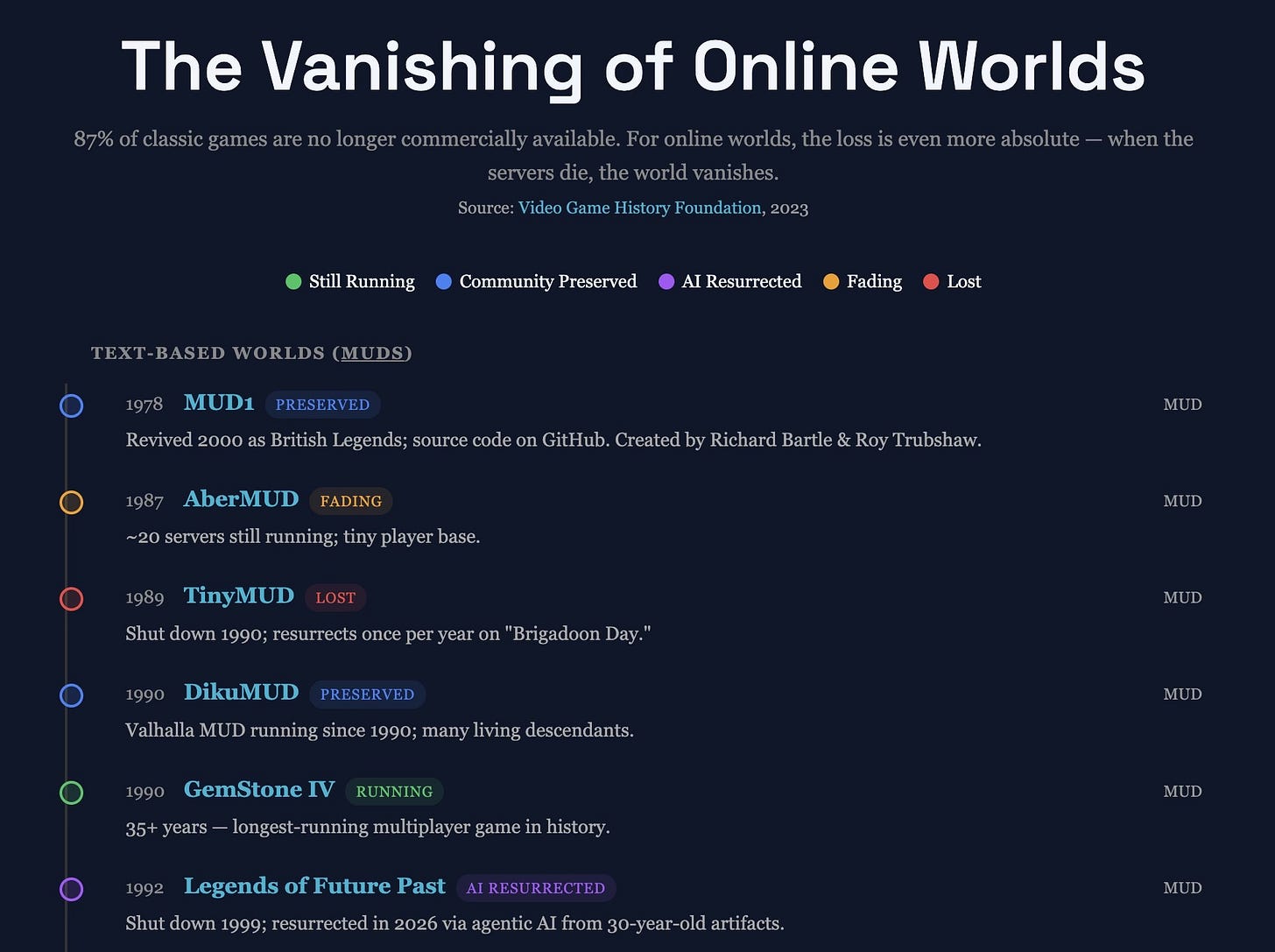 This is a pattern that should worry anyone who cares about creative history. The Video Game History Foundation found that 87% of classic games released before 2010 are no longer commercially available. For single-player games, at least the software artifact persists somewhere. But multiplayer online worlds? They only ever lived on servers. When those servers shut down, the world vanishes. It’s as if someone burned every copy of a novel and demolished the library that held it.