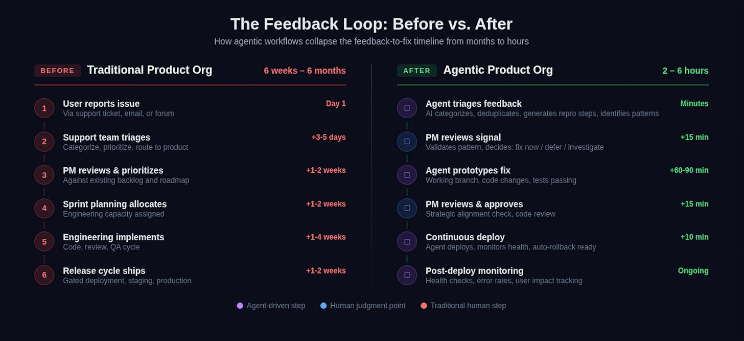Rapid prototyping of fixes. When a critical feedback pattern emerges, an agent can prototype the fix — not just write the code, but create a working branch, run tests, and present the human with a reviewable solution. The product lead’s job isn’t to spec the fix and wait for engineering. It’s to evaluate whether the fix aligns with the broader product direction and approve it.
