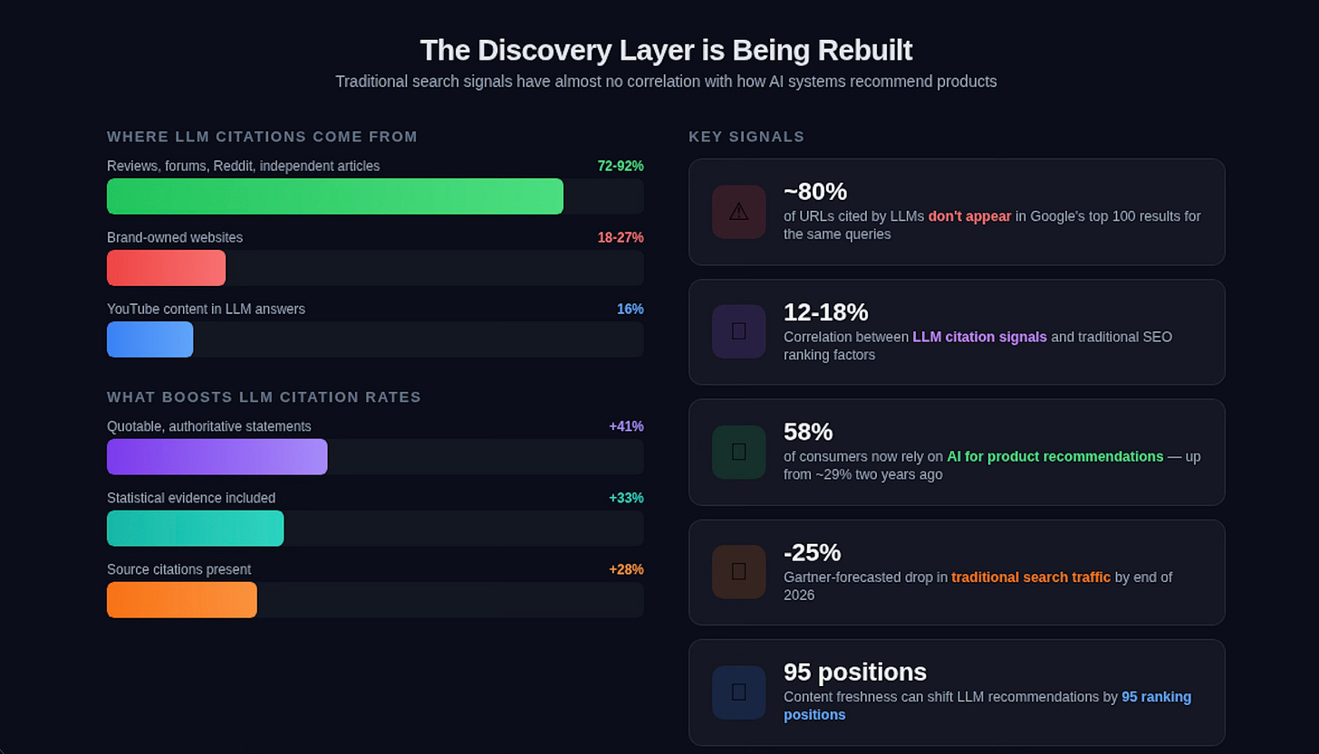 Read that again. The content that AI systems recommend to users has almost no correlation with traditional search rankings. LLM citation signals correlate only 12-18% with traditional SEO. And this matters enormously, because 58% of consumers now rely on AI for product recommendations—up from roughly 29% just two years ago.
