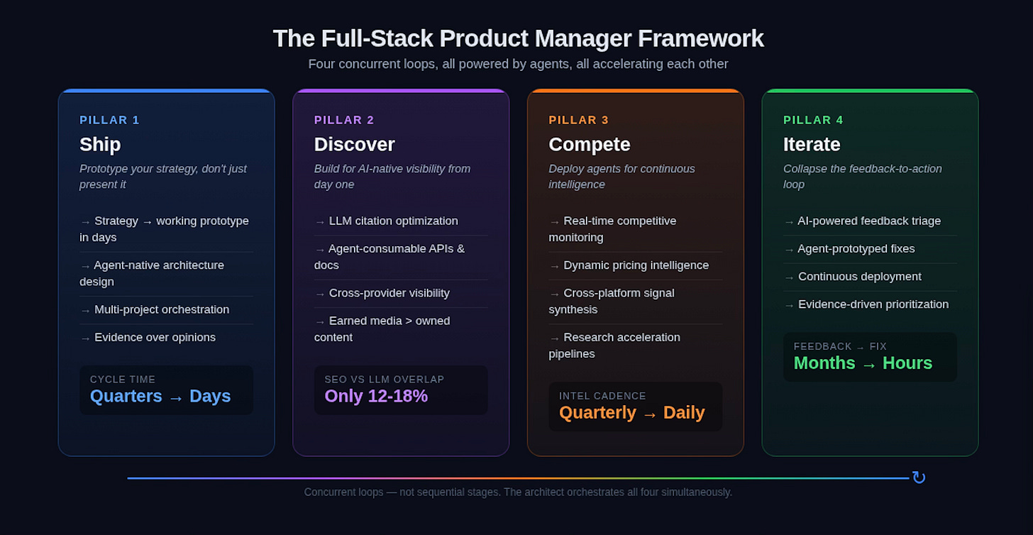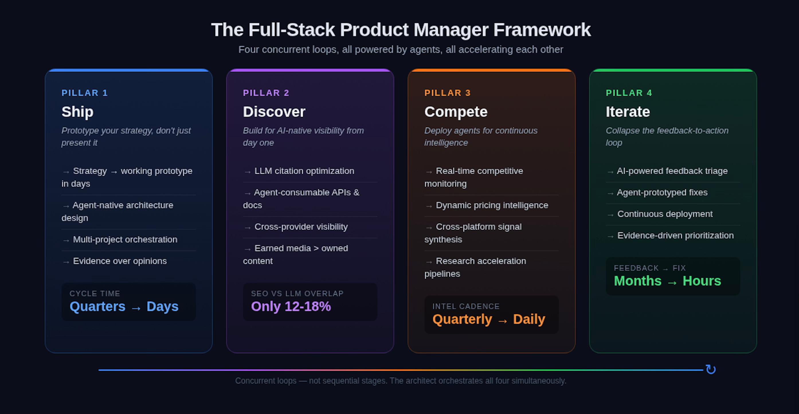 The four pillars—Ship, Discover, Compete, Iterate—aren’t sequential. They’re concurrent loops, all running simultaneously, all powered by agents, all accelerating each other. The product leader who can orchestrate all four is operating at a velocity that traditional product organizations simply cannot match.