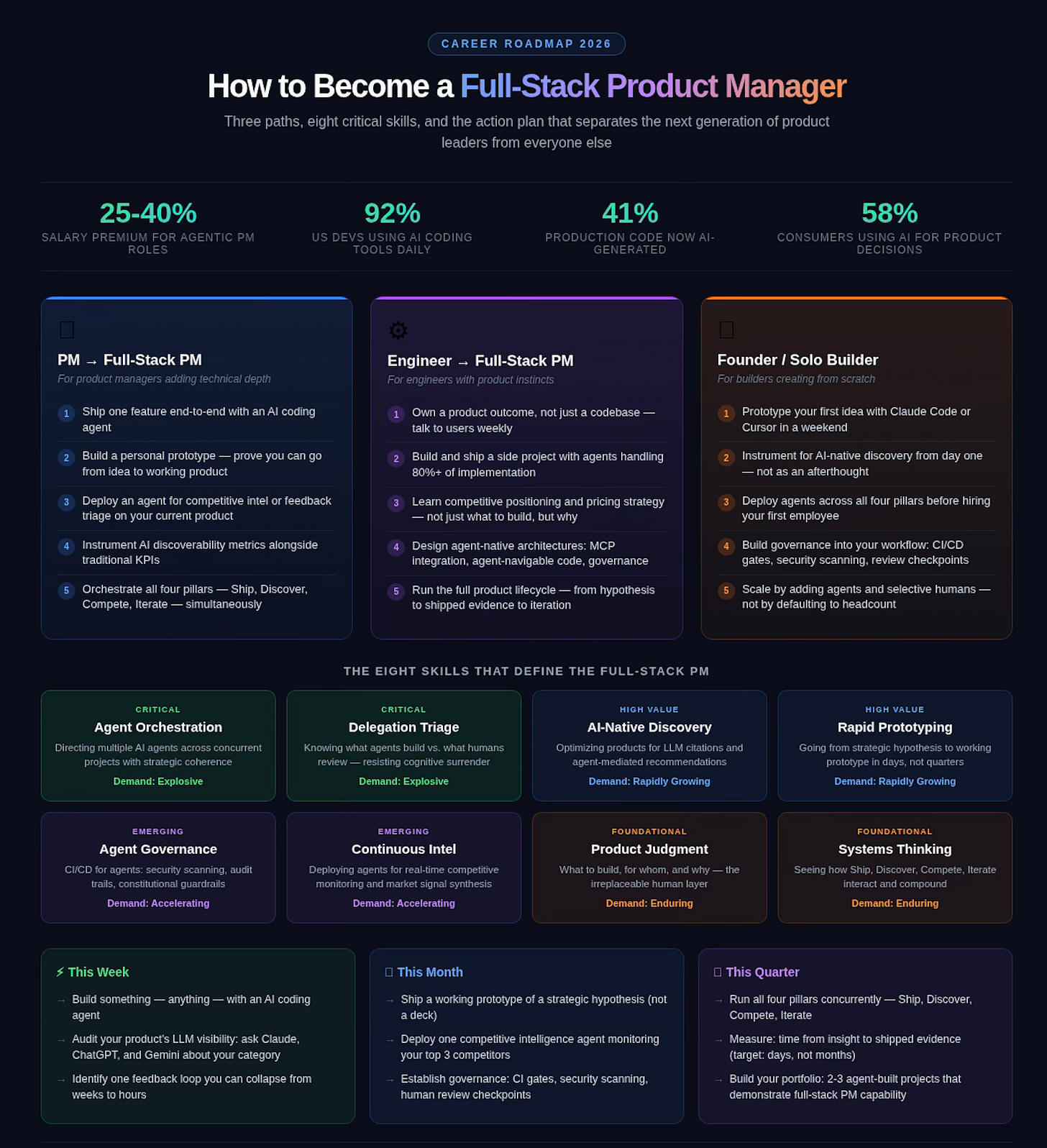 If you’re a technical PM or builder—or a software engineer with product instincts: you’re already closer to this than you think. The skills that matter in the agentic era aren’t new. They’re product judgment—knowing what to build, for whom, and why—combined with the ability to actually build it, rapidly, using agents as force multipliers. The full-stack PM doesn’t replace product thinking with engineering. They unify them. And that convergence runs both directions: PMs who can prototype are leveling up, and engineers who understand users and markets are becoming the PMs. The 25-40% salary premium that agentic PM roles command over generalist PMs right now isn’t about prompt engineering skill—it’s about this integration of strategic judgment and execution capability.