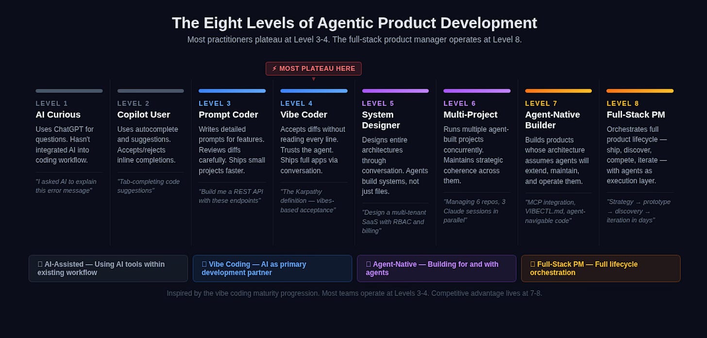 The levels beyond that are where the real transformation happens. Level 5 is directing agents across entire architectures: not just writing code, but designing systems through conversation. Level 6 is running multiple agent-built projects concurrently, maintaining strategic coherence across them. Level 7 is building agent-native infrastructure; products whose architecture assumes AI agents will extend, maintain, and operate them. And Level 8 is the full-stack PM: orchestrating the full product lifecycle, from competitive intelligence through shipping through discovery, with agents as the primary execution layer and human judgment as the strategic spine.