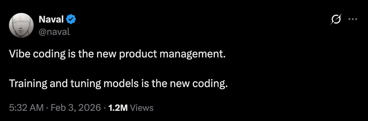 Naval Ravikant observed that “vibe coding is the new product management.” He was right about the direction but underestimated the magnitude. Vibe coding doesn’t replace product management. It subsumes it, absorbing specification, prototyping, testing, and initial deployment into a single fluid workflow that one person with the right strategic instincts can drive.