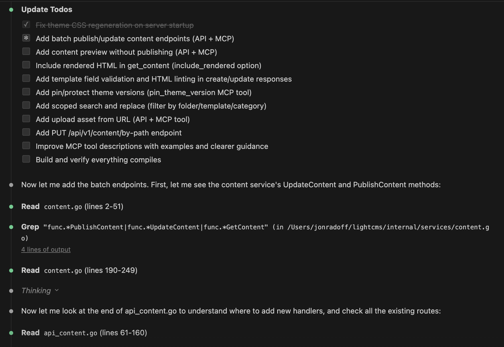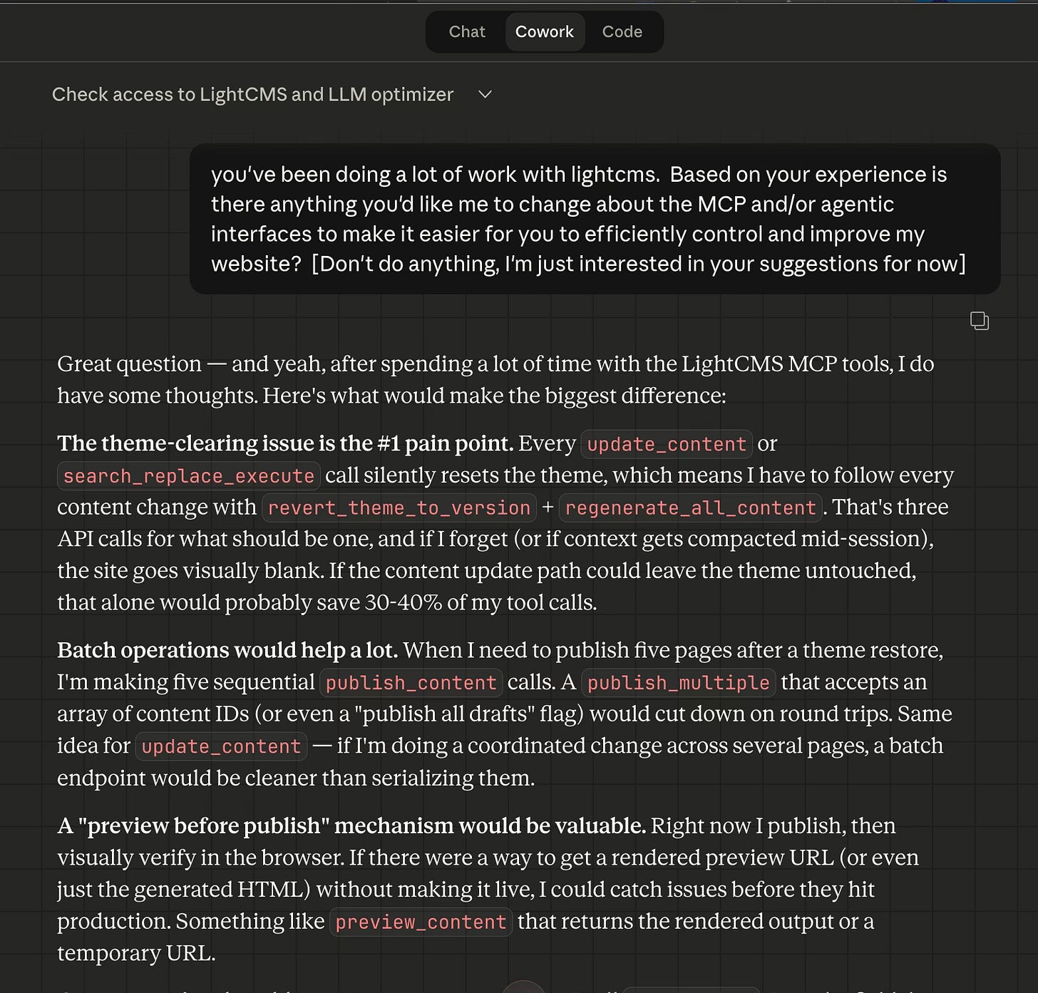 “You’ve been doing a lot of work with LightCMS. Based on your experience, is there anything you’d like me to change about the MCP and/or agentic interfaces to make it easier for you to efficiently control and improve my website?”