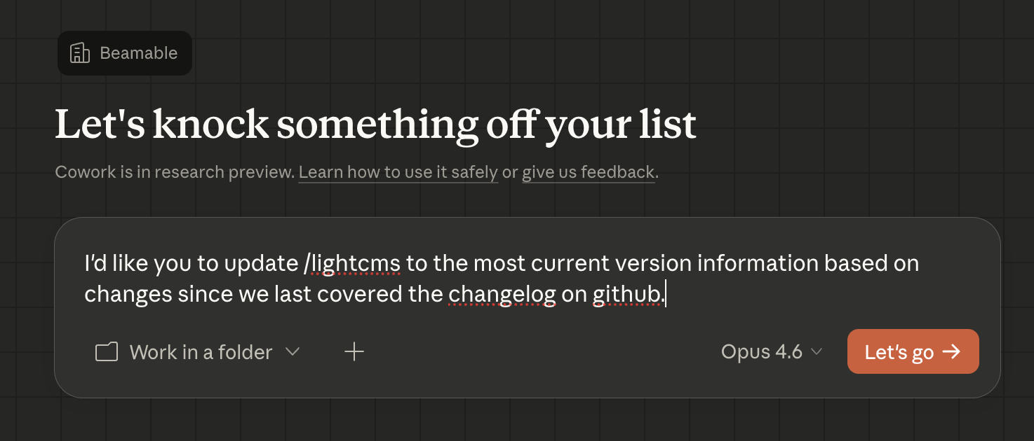 Here’s what my typical website update looks like in 2026. I open Anthropic’s Cowork: a desktop AI agent that connects to LightCMS through MCP (the Model Context Protocol) — and I type something like: “Update the /lightcms page to reflect the latest version changes, and update the version history to match the changelog on GitHub.”
