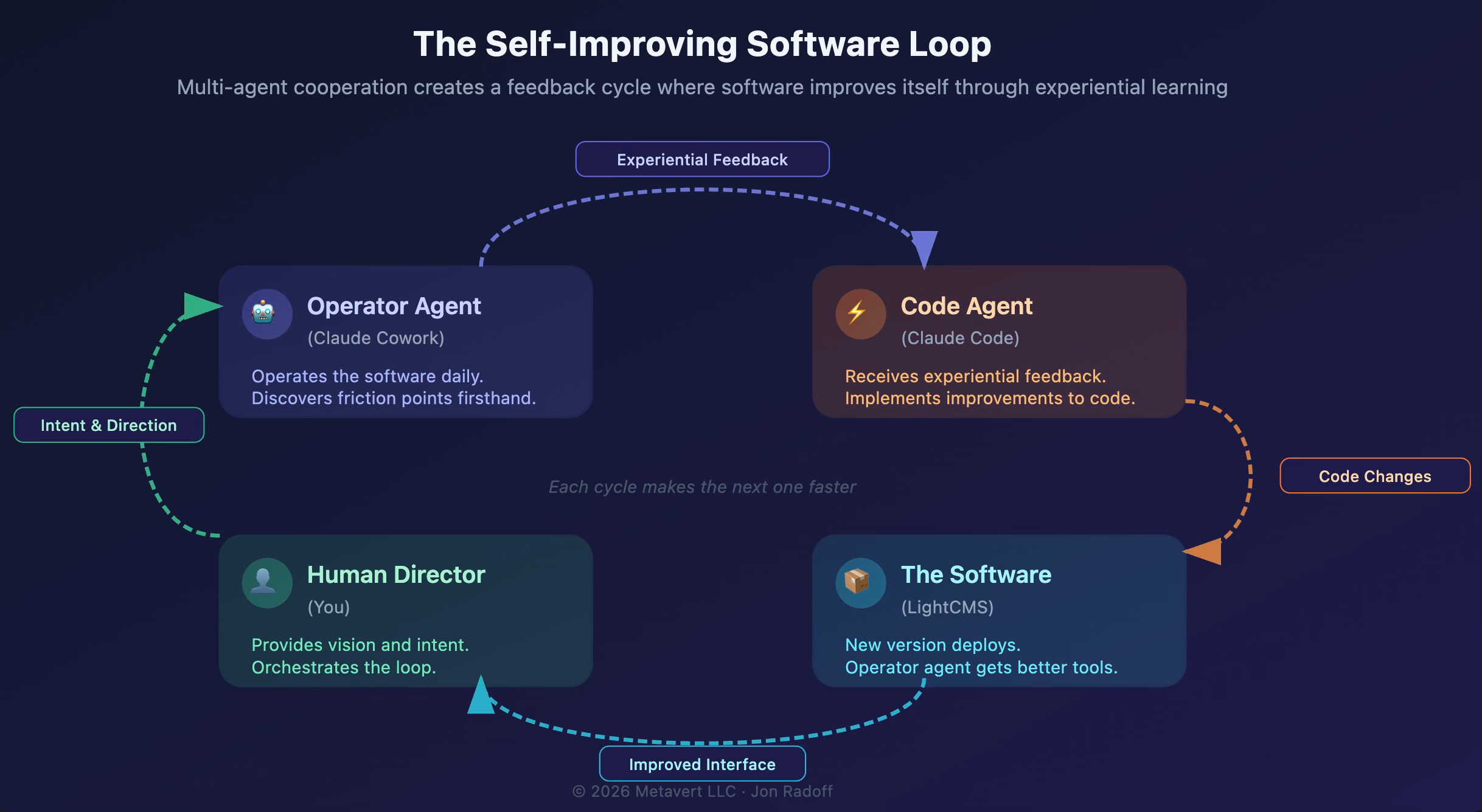 1. An operator agent runs the software in production, accumulating experiential knowledge about friction, bugs, and inefficiencies. This knowledge is grounded, specific, and weighted by actual impact.