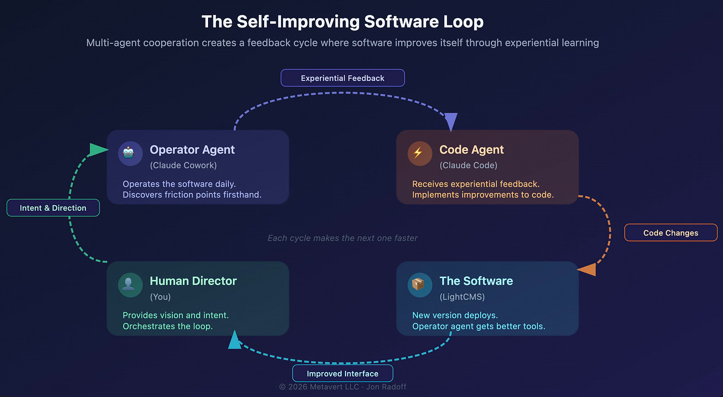 On Monday morning I asked an AI agent for its feedback on the software tool it was using to update my website. Then I handed the answer to a different AI agent to fix it. An hour or so later, the first agent was using the improved version and running verification tests. No human wrote a line of code. No human triaged a single bug. The software literally improved itself, through a feedback loop between two agents that each understood different aspects of the problem.