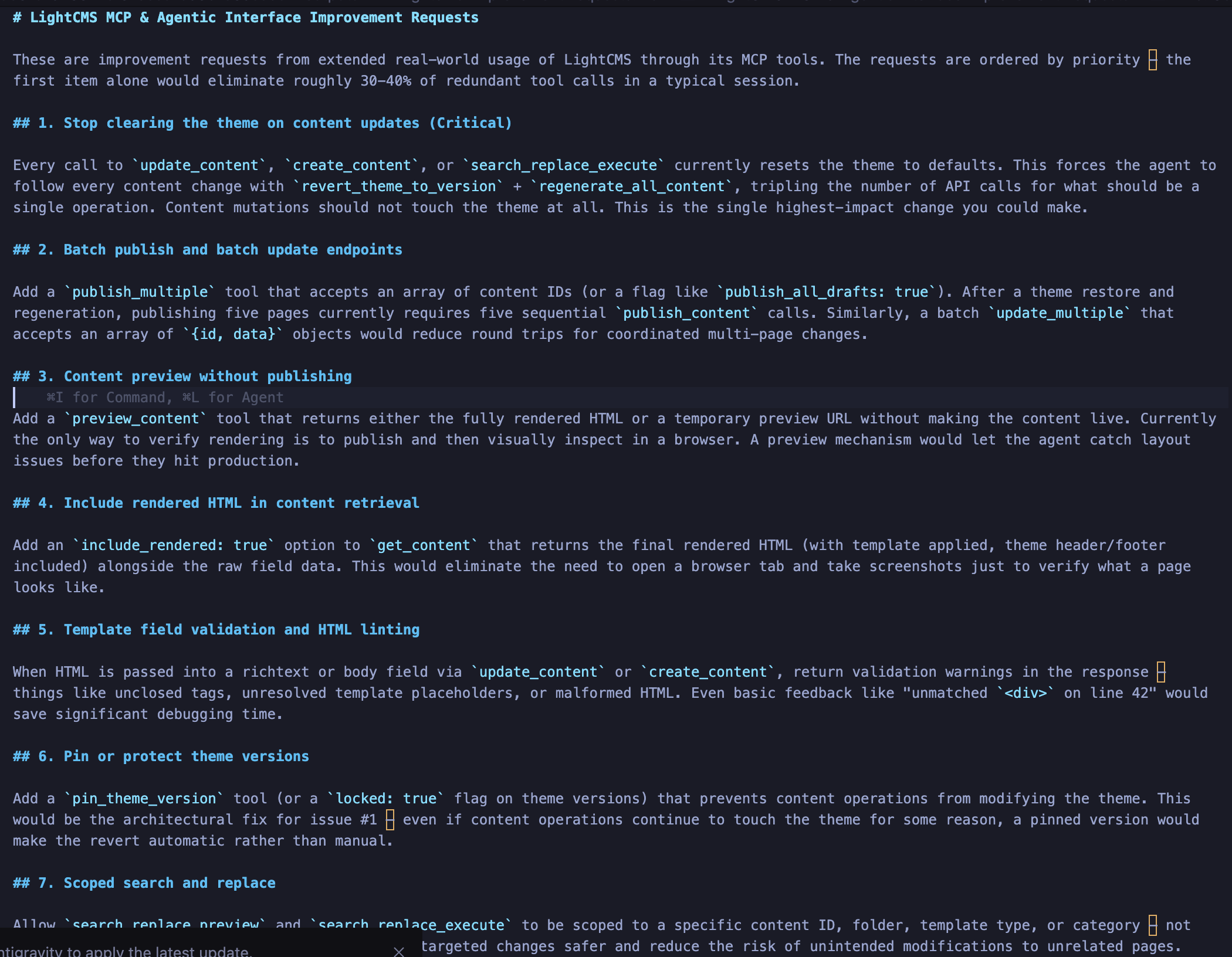 The theme-clearing bug was flagged as critical: the agent estimated it accounted for 30–40% of redundant tool calls in a typical session. Batch publish was high priority because the agent was making five sequential publish calls after every theme restore. Content preview was requested because the only way to verify rendering was to publish first and then visually inspect in a browser. Theme version pinning was suggested as an architectural safeguard. Scoped search-and-replace was requested because site-wide replacement felt risky when the agent only needed to change content in one folder.