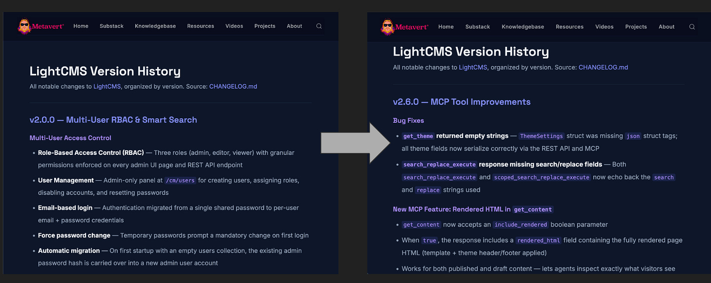 I’ve been running my website, metavert.io, on LightCMS: the open-source content management system I built with Claude Code for the age of AI agents. The entire site is managed through conversation: I tell an AI agent what I want, and it creates pages, updates themes, publishes content. No dashboard, no forms, no page builder loading screens. This is the workflow I described in I Built a CMS for the Age of Agents: the website as conversation.