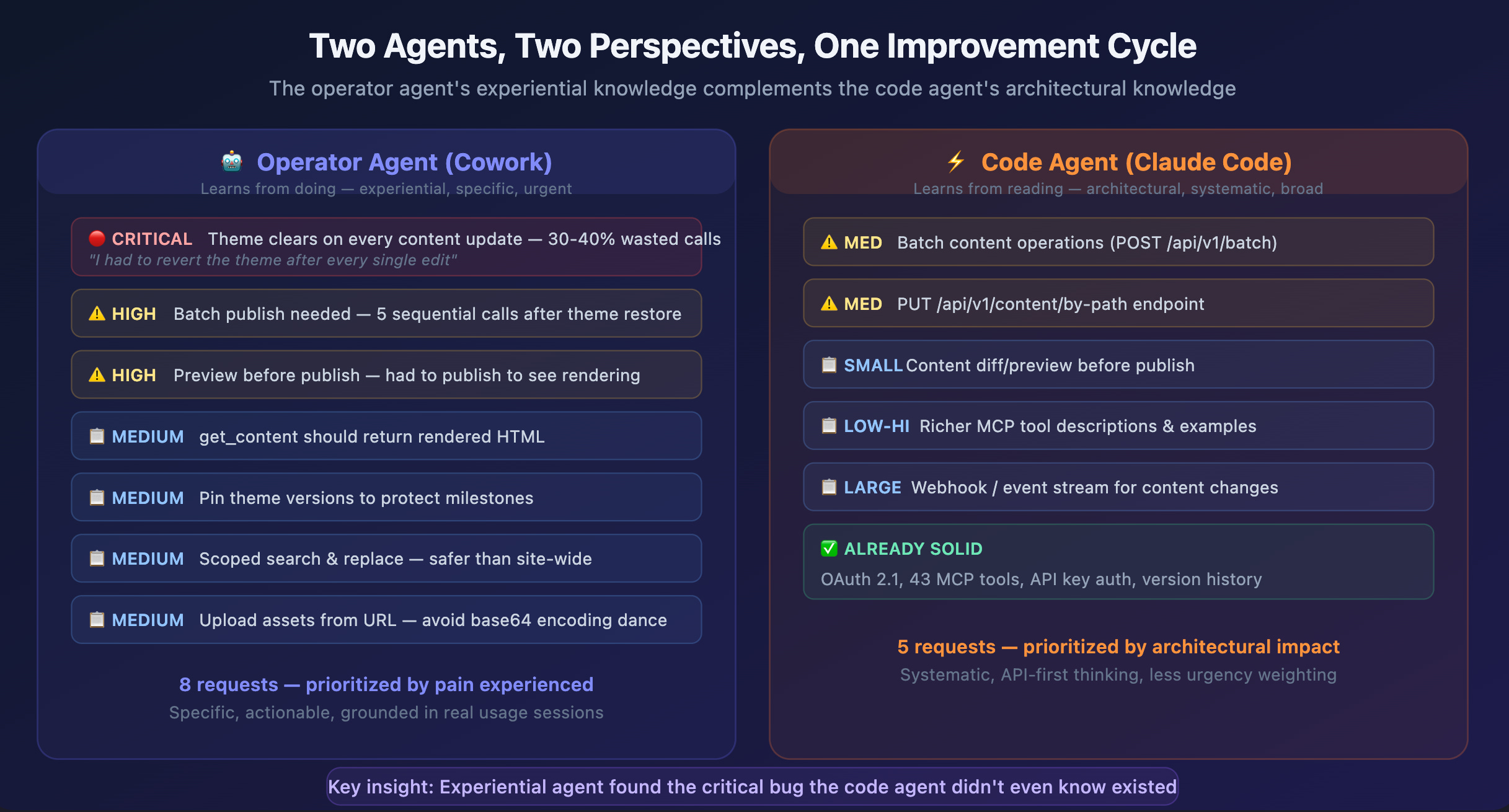 Some ideas converged: both agents wanted batch operations, both wanted content preview, both wanted better tool descriptions. But there were critical divergences. The theme-clearing bug — which Cowork flagged as the single highest-priority issue, the one that was tripling its API calls and risking visual breakage on the live site — didn’t appear in Claude Code’s analysis at all. Claude Code had never operated the software in production. It had only built it. The bug was invisible from the inside.