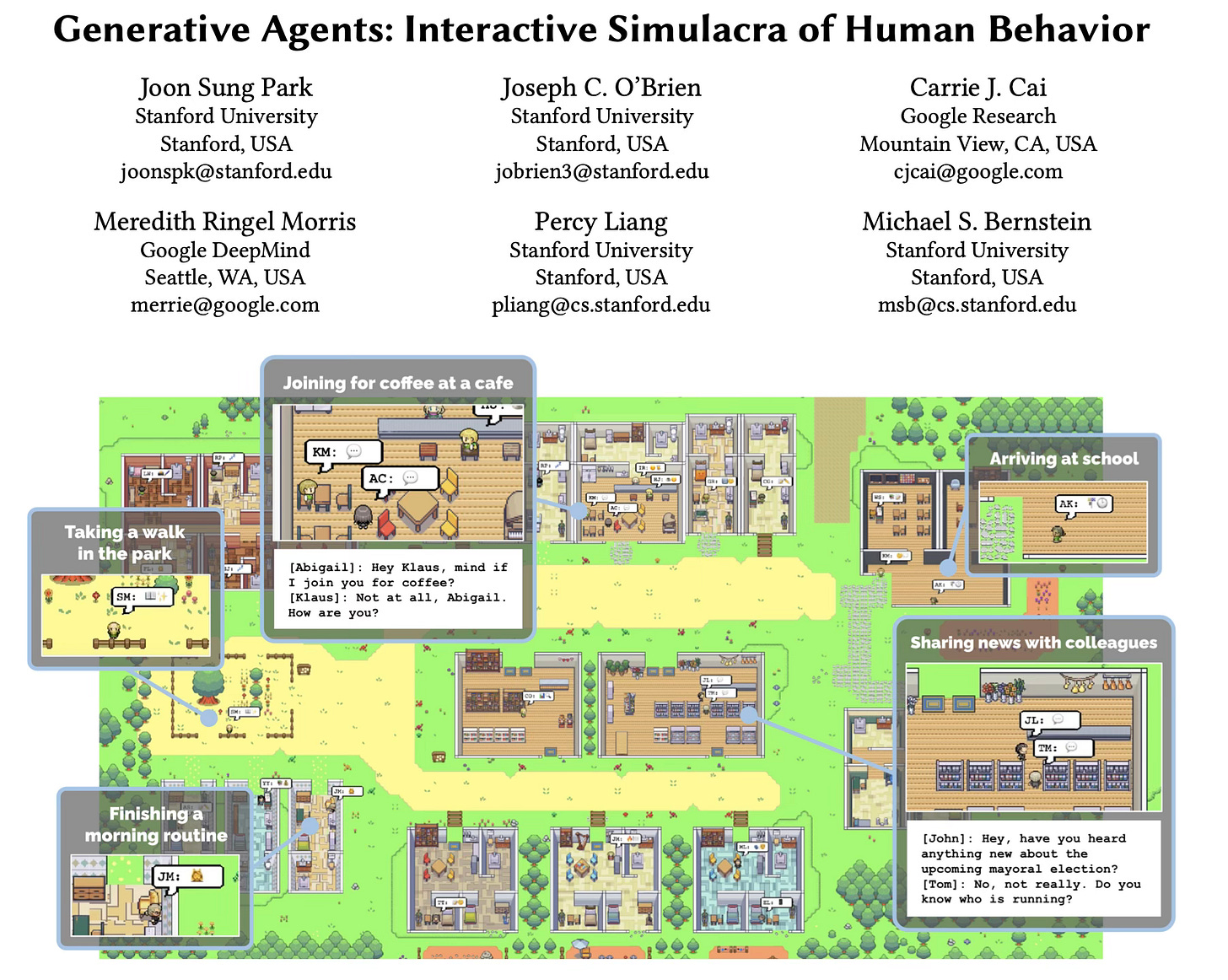 A society full of generative agents is marked by emergent social dynamics where new relationships are formed, information diffuses, and coordination arises across agents.
