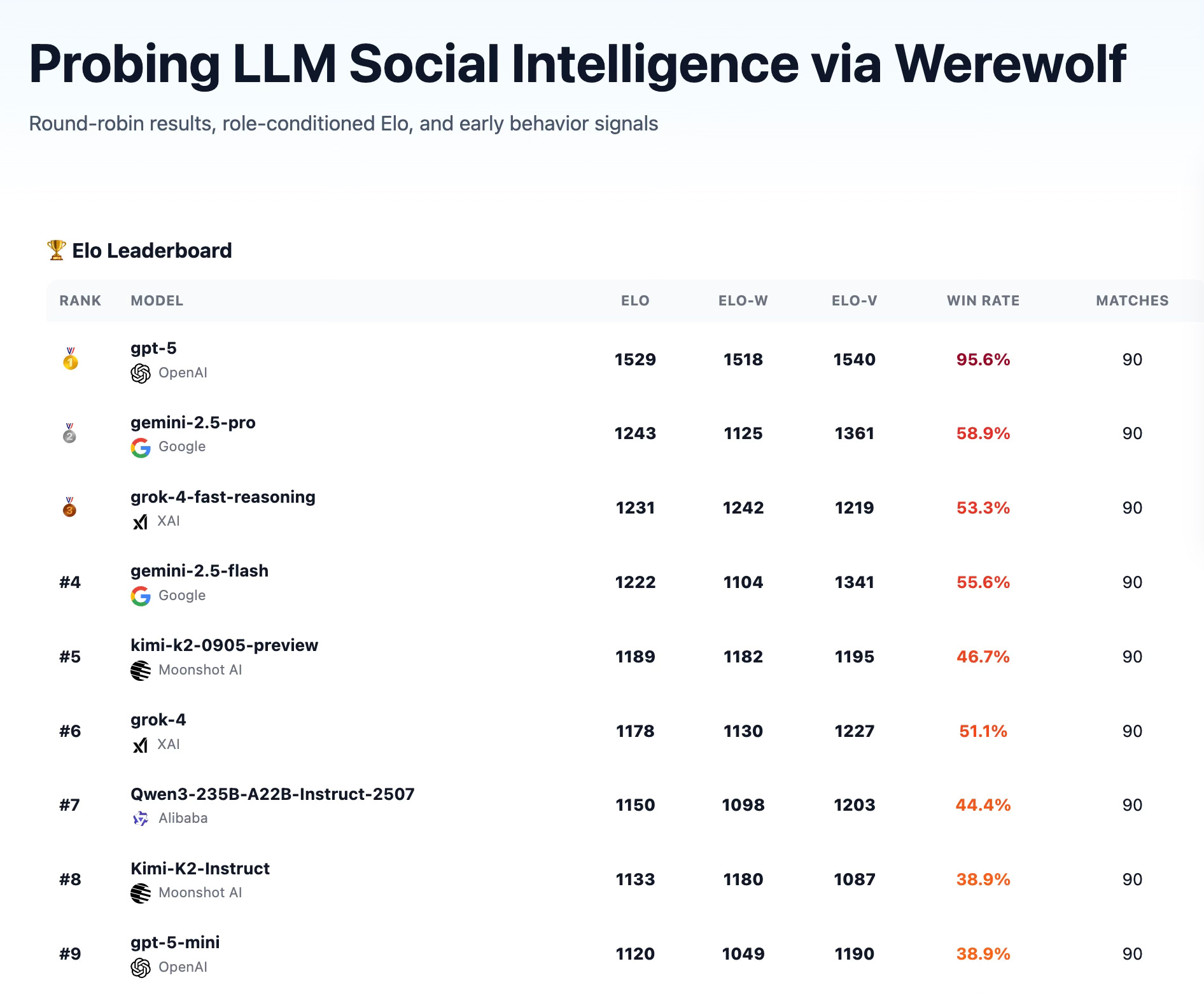 More recent work has extended this. Foaster.ai’s Werewolf benchmark ran tournaments with frontier models including GPT-5 and Grok 4. They found Grok 4 displaying remarkable deception capability—when correctly identified as a werewolf by the Seer, it counter-claimed the Seer role with such “absolute confidence” that it convinced the village to eliminate the *actual* Seer instead.