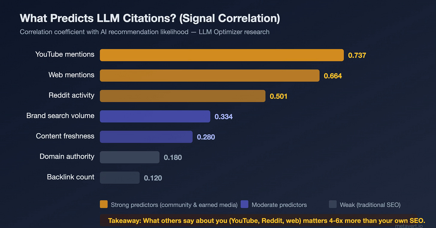 Here’s why. Traditional SEO optimizes for Google’s ranking algorithm: backlinks, domain authority, keyword density, page speed. GEO optimizes for something different entirely: the likelihood that a language model will cite, recommend, or surface your brand when answering a relevant question. And the signals that drive LLM citations are only 12–18% correlated with traditional SEO signals. Domain authority and backlinks, the bedrock of SEO for two decades, barely register.