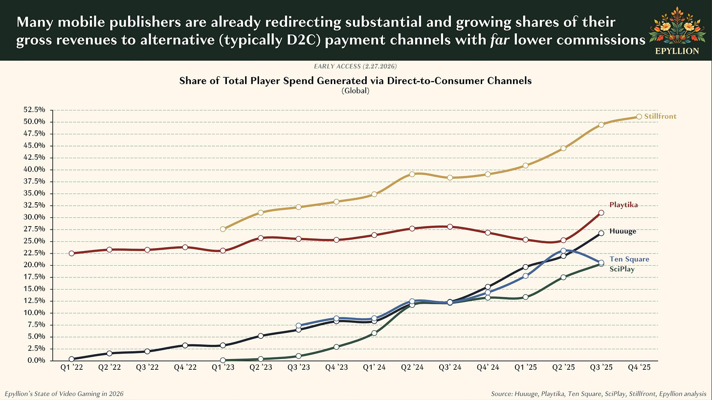 The numbers here are striking and immediate. According to Matthew Ball’s State of Video Gaming in 2026 report, some top game publishers now generate 30–50% of player spend through direct-to-consumer channels.