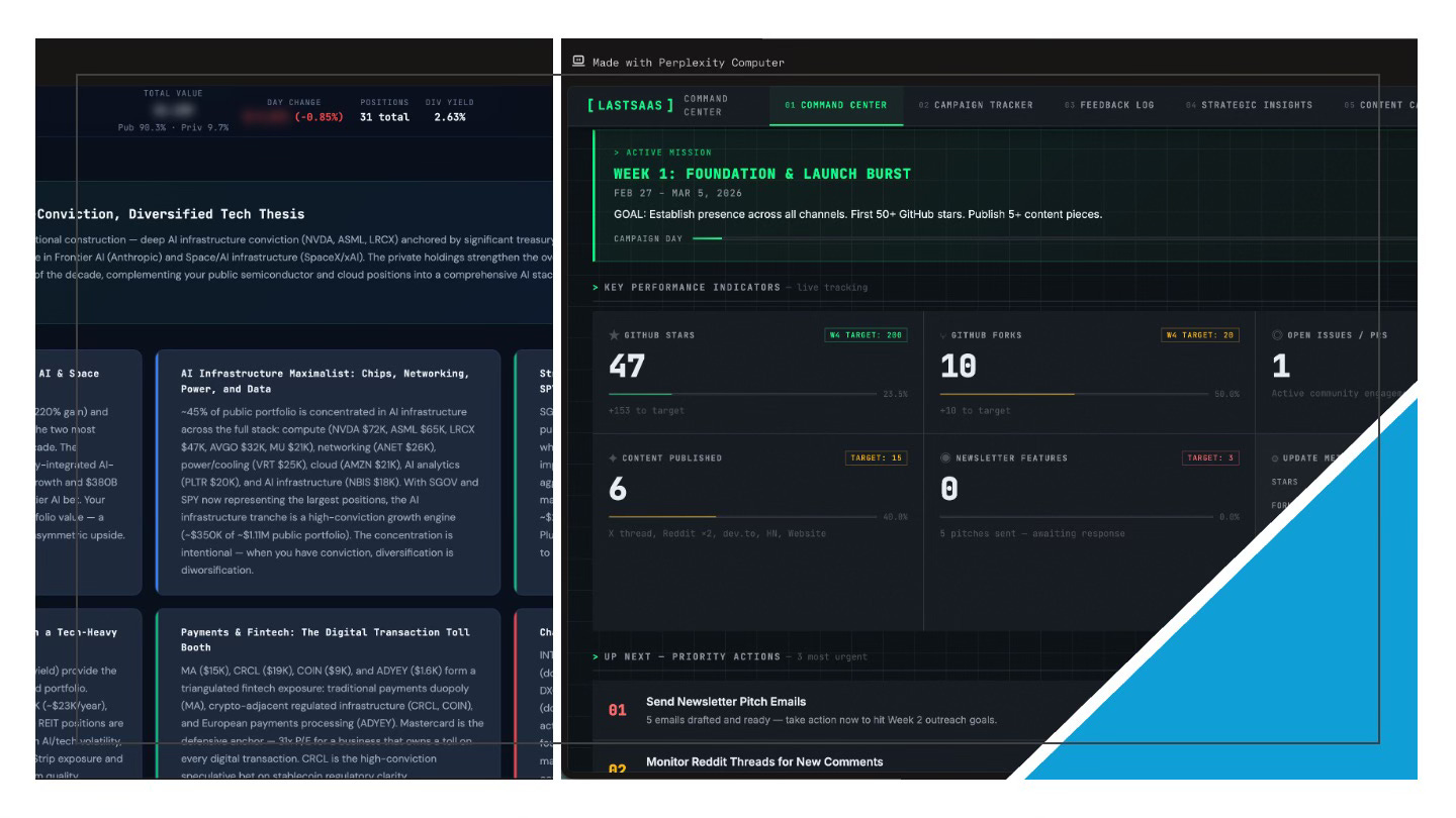 And what are all these tools building? Web apps. HTML, React, and Node are the default output targets for virtually every agentic coding platform: from Cursor and Bolt to Claude Code and Perplexity Computer. Perplexity Computer is especially interesting here: it orchestrates 19 models in parallel, has connectors to hundreds of web-native data providers, and outputs fully functional web applications. When I used it to create an agentic marketer for LastSaaS—and separately, a real-time investments dashboard with thesis analysis and scenario simulation—I described what I wanted in plain language and got back fully functional web applications: interactive charts, real-time data connectors, responsive layouts. No build step, no compilation, no App Store review. Just URLs. These weren’t “answers” in any traditional sense; they were bespoke software applications, composed on the fly, deployed to the web instantly. That’s the new multimodality: not text plus images, but answers that take the form of interactive tools.