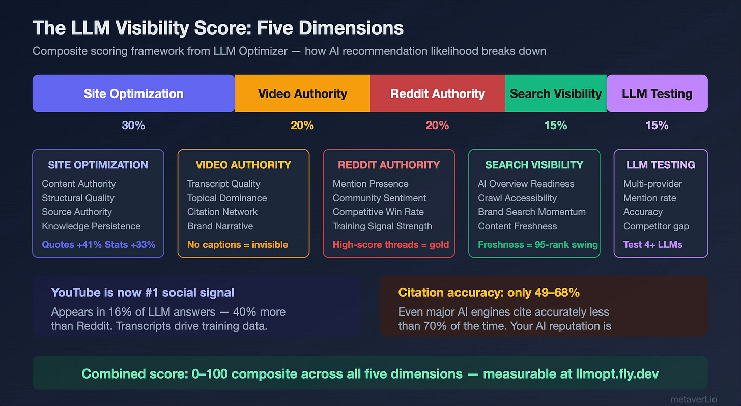 I’ve been hacking together LLM Optimizer to make these dynamics measurable and actionable. It’s an app I’m currently testing with early users that analyzes your brand across five dimensions: site content optimization, video authority (YouTube), Reddit presence, search visibility, and direct LLM testing across Claude, ChatGPT, Gemini, and Grok—and produces a composite visibility score with specific, evidence-based recommendations.3