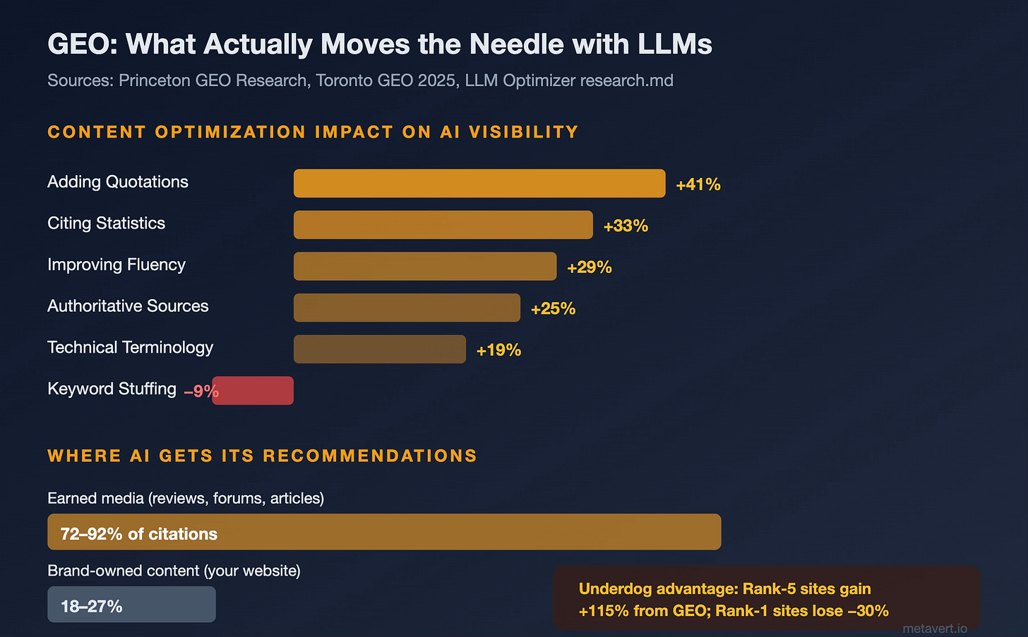 Quotability is king. Adding quotable statements from authoritative sources produces the single largest visibility improvement: +41% in LLM citations. Statistics provide +33%. Improving overall fluency and readability: +29%. Authoritative source references: +25%. Meanwhile, traditional keyword stuffing — the junk-food of SEO — actually hurts your AI visibility by 9%. LLMs aren’t matching keywords; they’re evaluating whether your content is worth citing.