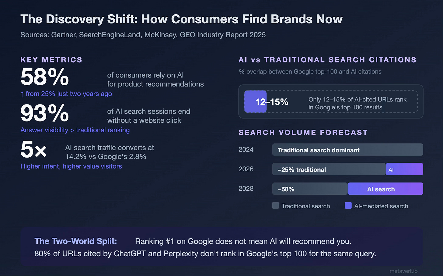 In Part 1, I described how search evolved from web directories to Google to LLM-powered answer engines, each transition driven by the same principle: whoever gives you better answers faster wins. That prediction has played out more aggressively than even I expected. Gartner now forecasts a 25% drop in traditional search engine volume by 2026, and AI search traffic converts at five times the rate of Google organic — 14.2% versus 2.8%. That’s not a rounding error. That’s a structural shift in the economics of attention.