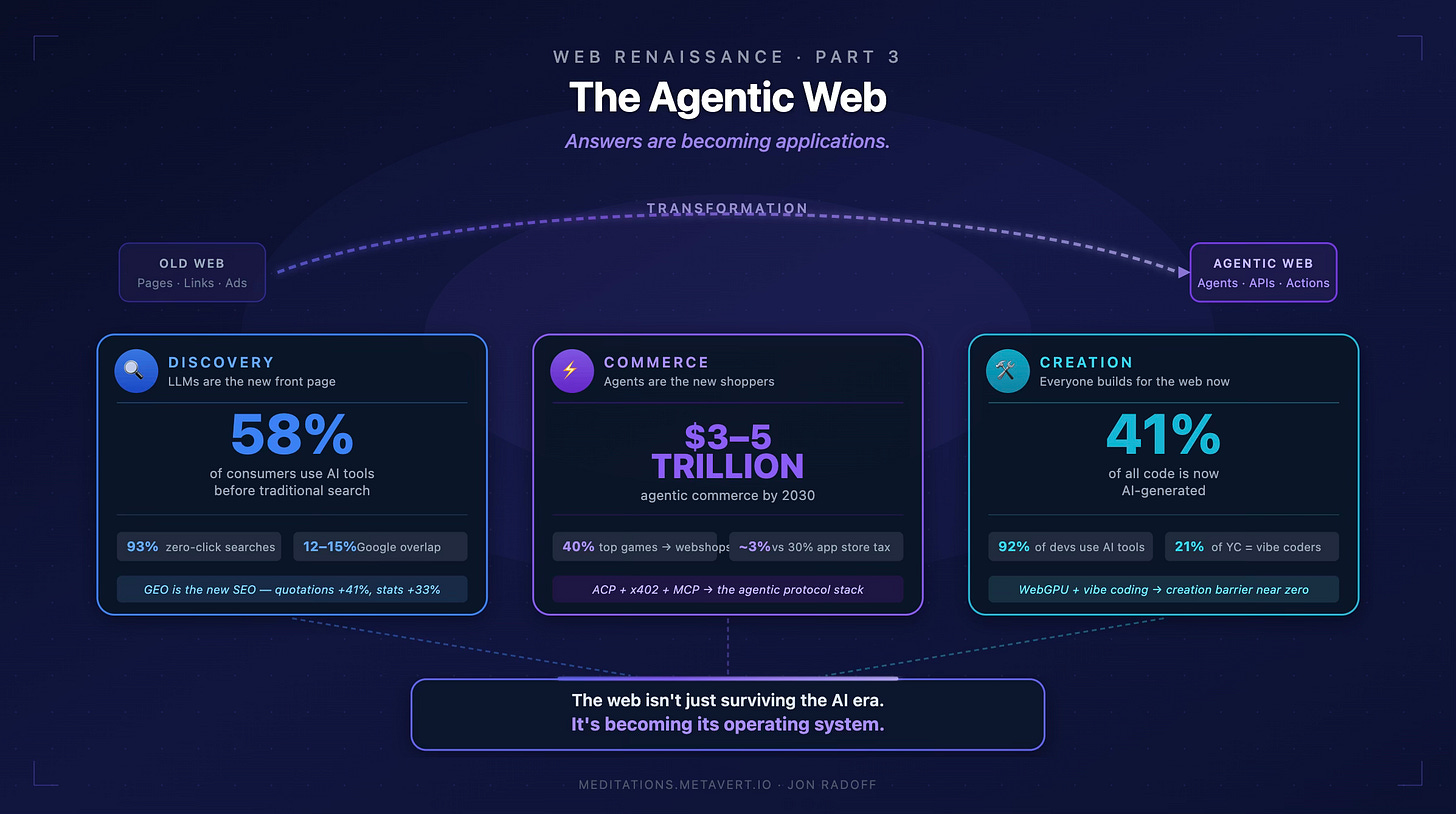 It took a while for me to finally write this Part 3. But the wait was worth it: because the changes that have landed in the last two years are not incremental. They’re structural. Three forces have converged—a revolution in how people discover brands and products through AI, a new payments infrastructure built for agents to transact on behalf of humans (and each other), and a dramatic expansion of who can build for the web and what they can build. Together, they amount to something I can only describe as the agentic web.