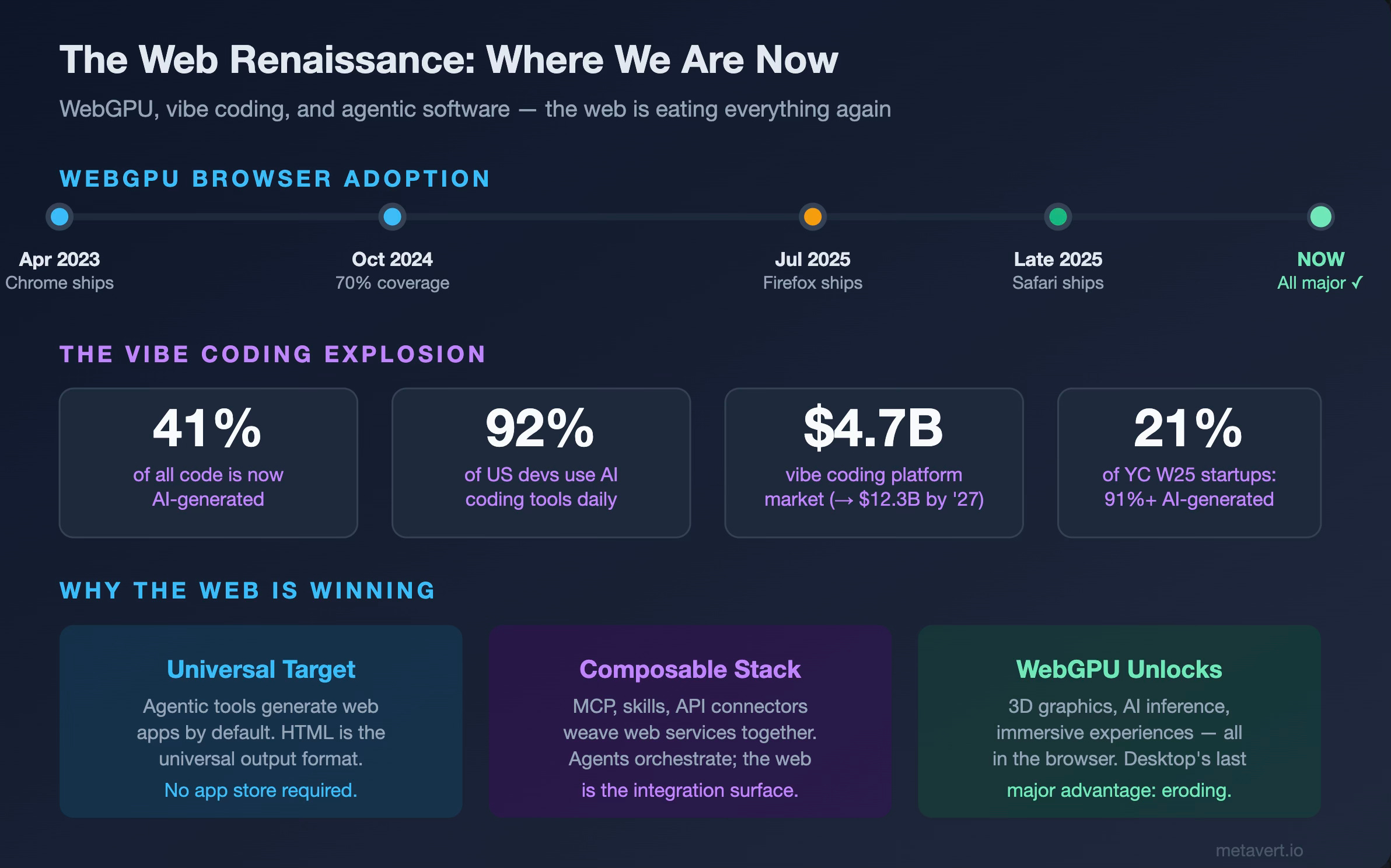 The significance of this is not just that browsers can render prettier graphics. It’s that one of desktop software’s last remaining advantages (high-performance GPU access for 3D rendering, AI inference, and immersive experiences) is now accessible through a URL. No download, no install, no app store. We’ll return to why this matters when we talk about web development later.