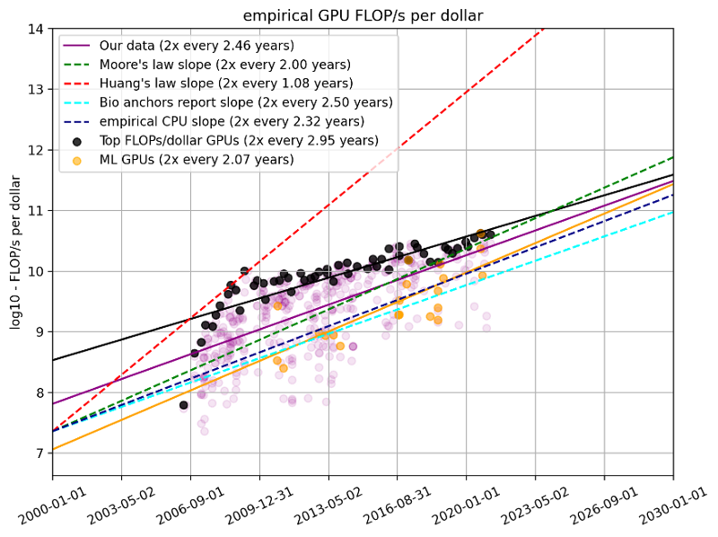 Fortunately, cost per FLOP is decreasing at the same time: