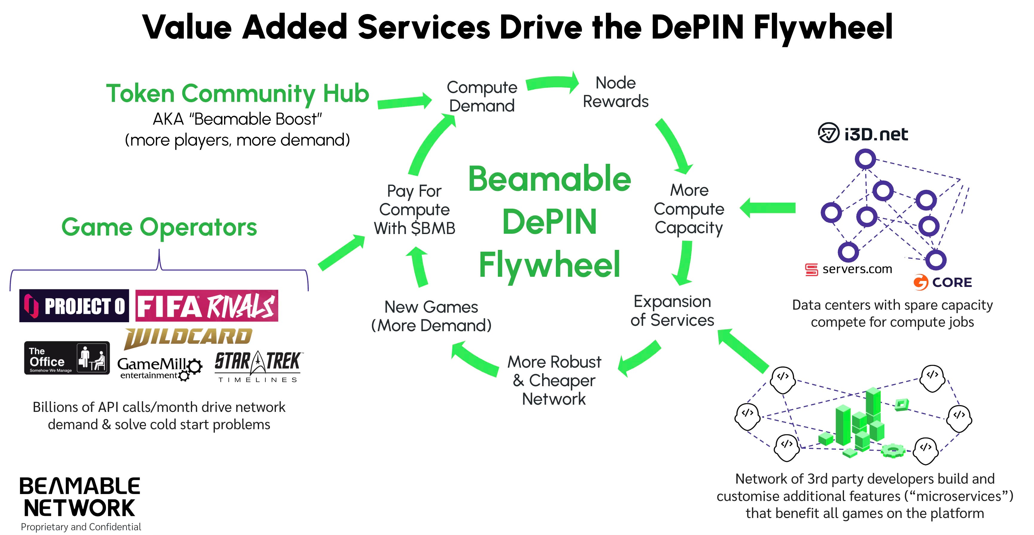 Beamable Network is not just about providing compute but enabling value-added services needed by game developers—especially those that can drive a growth flywheel across our community, our game studios, and protocol. Whereas hyperscale cloud providers such as AWS grew by offering services beyond raw compute (with Beamable this is enabled through its open plug-in ecosystem), Beamable Network can also grow by offering services that drive usage and revenue.
